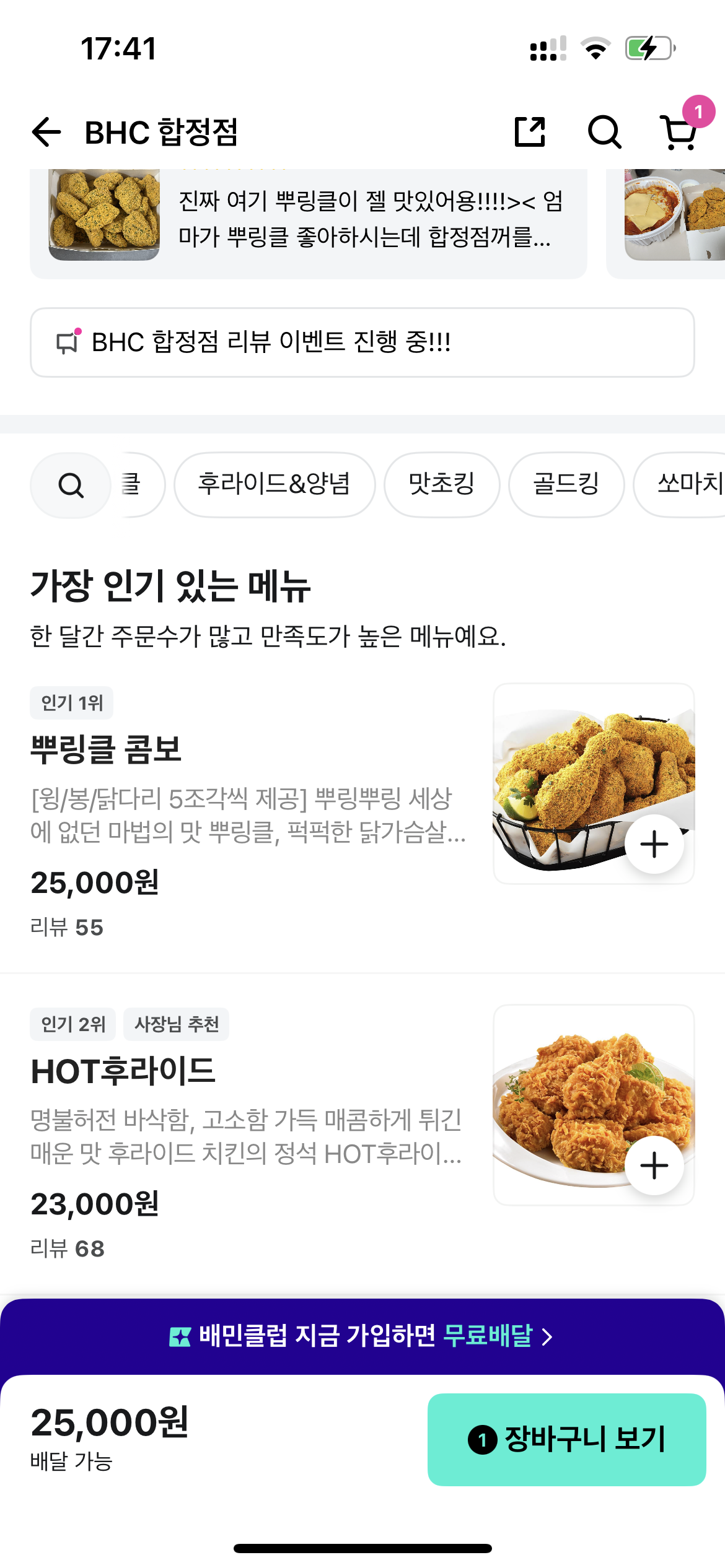 Back to main page of the restaurant then click the "View Shopping-cart" (장바구니 보기) button at the bottom of the cart screen. Make final-check your order, then click "주문하기" button.